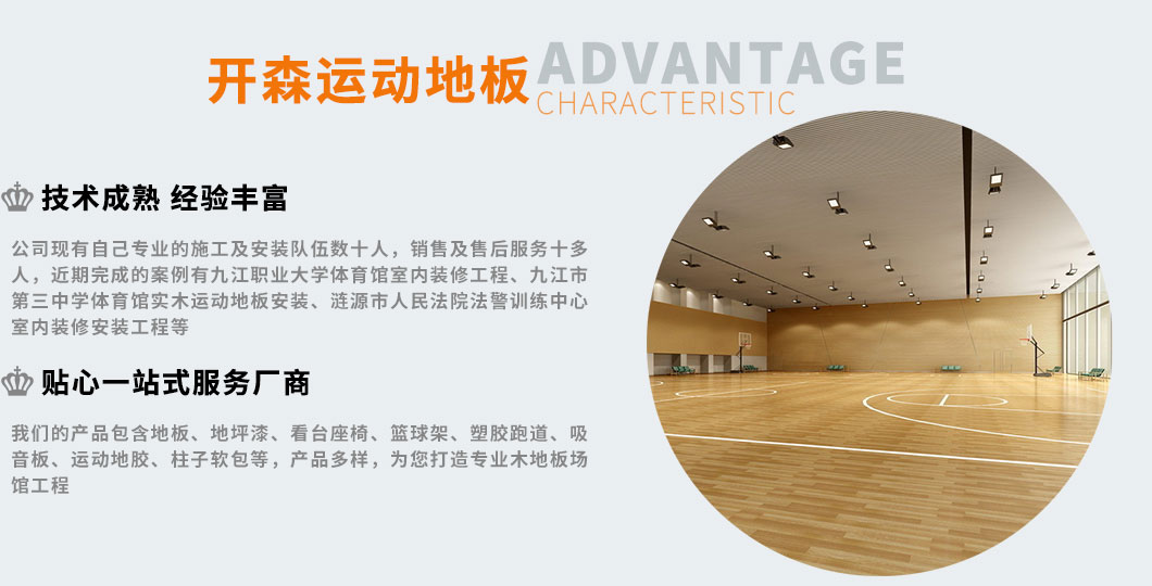 九江開森地板有限公司是集運動木地板生產、安裝與銷售一體的廠家,專業化的技術隊伍,國際先進的施工設備,我們的管理層擁有多年體育場館建造經驗,在業界獲得良好聲譽及甲方的好評。